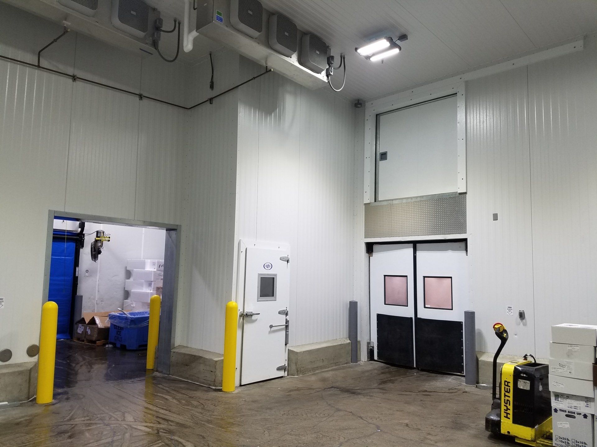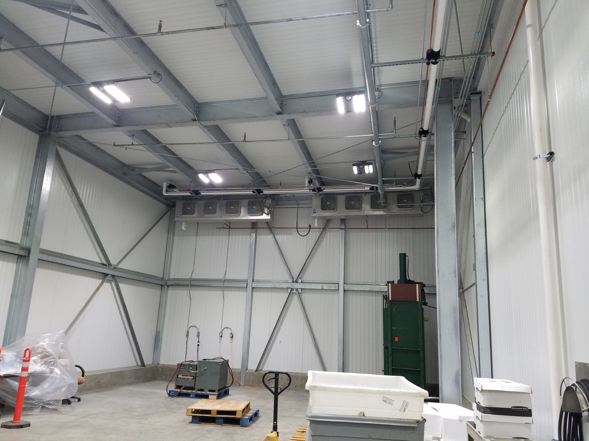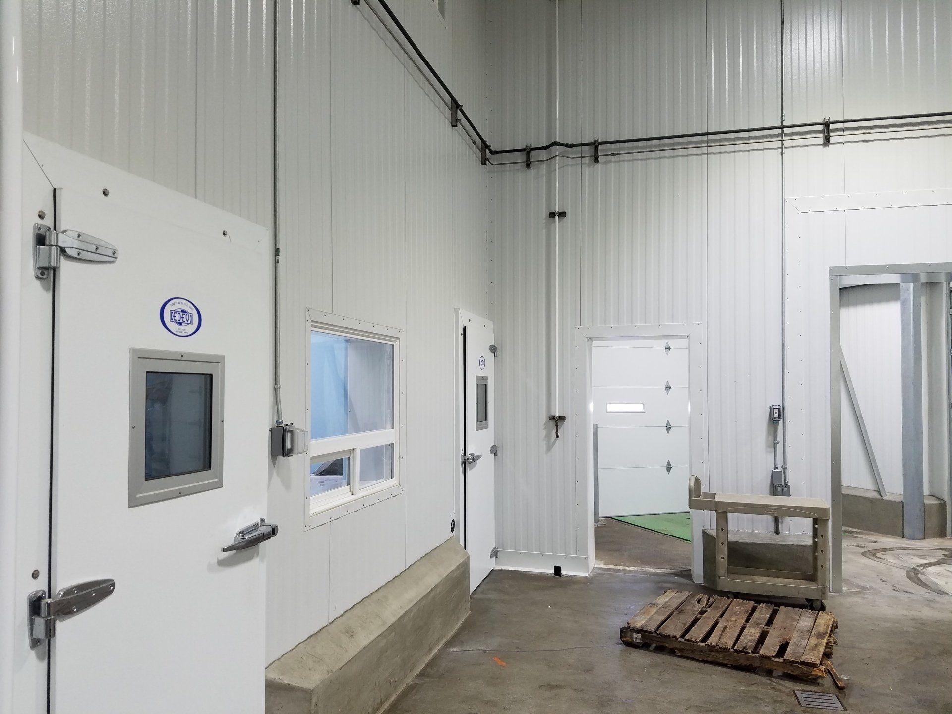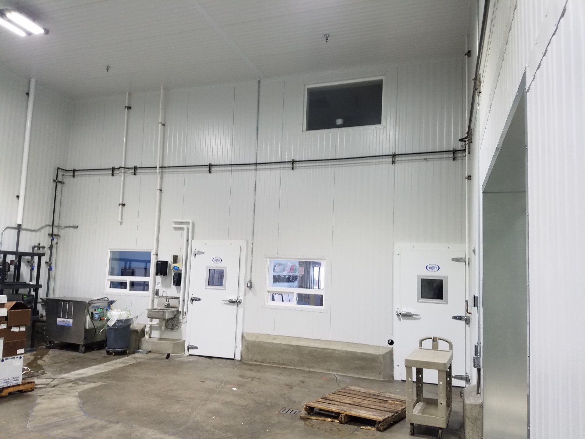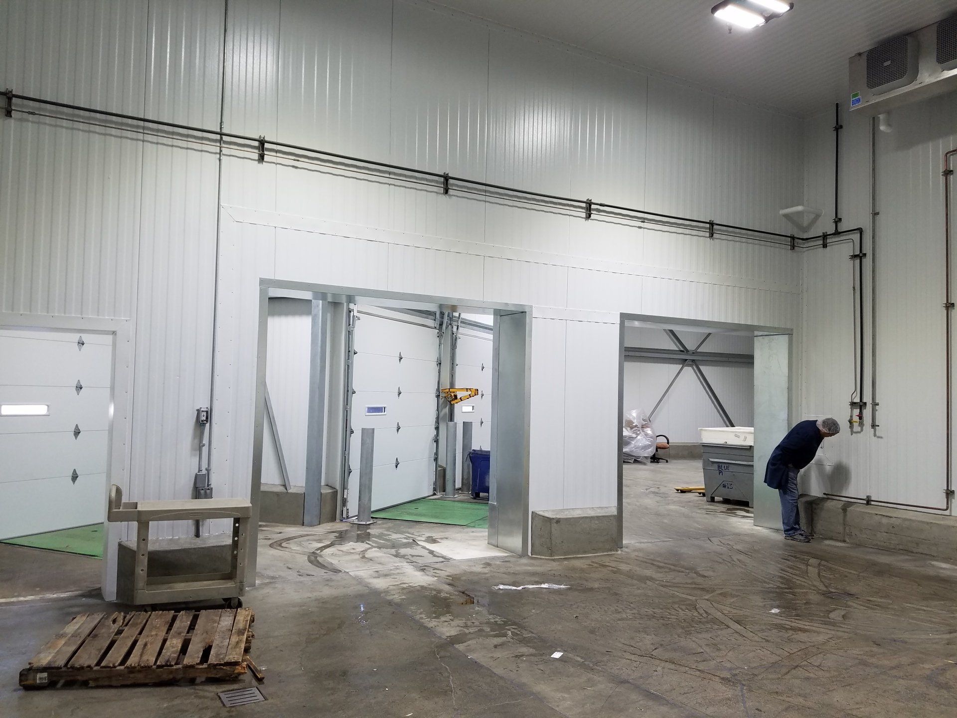 Clarion was able to convert an existing open-air dock into a 1,400 sq. ft. cold space. By fabricating a custom, galvanized-steel structure, and pairing with Metl-span exterior wall and roof panel system, Clarion was able to gain a large space in a small working area. Clarion partnered with Source Refrigeration to install all process room grade refrigeration equipment. The new dock required a dry overhead fire sprinkler system with a dry air compressor. Clarion formed and poured a 21 sq. ft. ice melting pit with a circulating glycol under floor-warming system, and added all up to date LED lighting and energy efficient equipment.