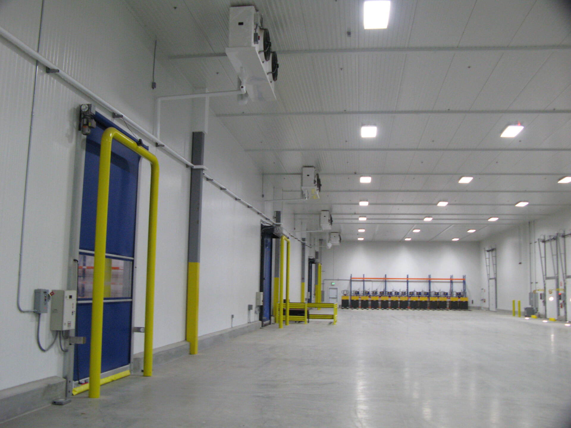 The new facility consists of 60,000 sq. ft. of freezer, cooler and cool dock area including high speed roll-up doors with motion activation, sanitary panels and ultra-efficient refrigeration systems, including rebate qualifying urethane core panels with USDA white steel finishes throughout the 35 degree clear facility. Concrete curbs provide lasting protection for the wall panels. It contains 15,000 sq. ft. of cool dock and staging area with heavy duty dock levelers. The Freon based engine room provides the horsepower and computer integration required to condition the space to desired temps. State of the art refrigeration, insulation and lighting systems, qualified for the largest rebate check ever issued through the “Savings by Design” program established by Southern California Edison.