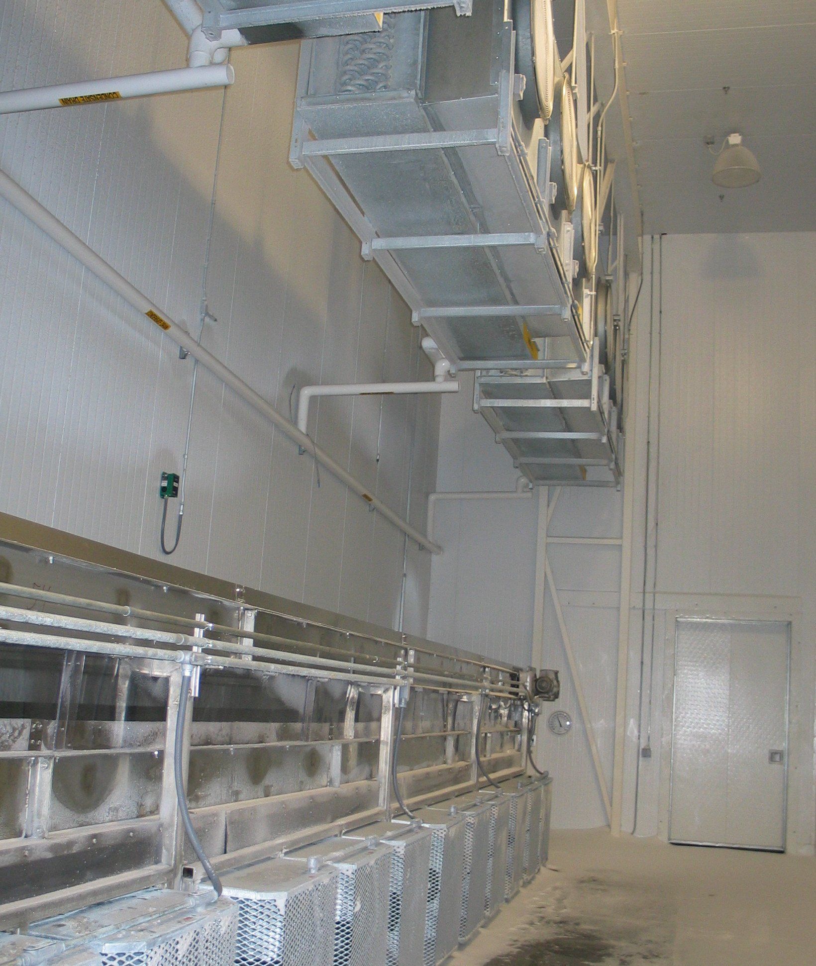 Left and right, the two rake bins store ice for the screw conveyor which moves the ice to the packaging area for bagging and eventual storage before it is distributed for sale.