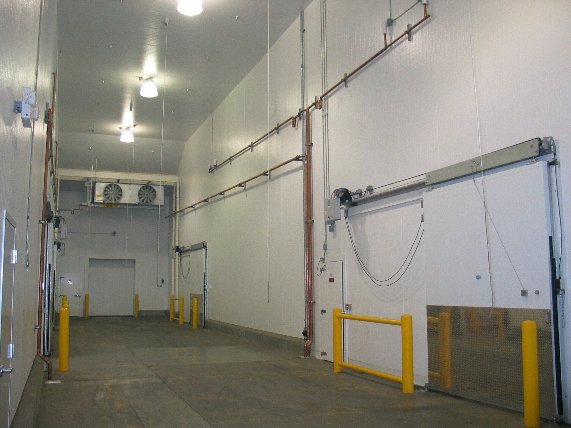The main corridor utilizes Edey electric, sliding doors to maintain consistent temperatures in both the freezers and the coolers; the blue Rytec door leads to the exterior.